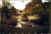 Tryckt text på kortet: "Uddevalla. Parti av Bäveån." "Förlag: J. F. Hallmans Bokhandel Uddevalla."