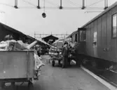 Radioreportage av red. Manne Berggren, Radiotjänst, om jularbetet i postkupén. Inlastning i postkupén i Katrineholm.