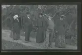 "Utklädda i 1800-tals kläder, Frida, Signe, Elsa, Anna, Annie." Två kvinnor klädda i herrkläder, tre andra klädda i äldre tiders klänningar på promenad.
