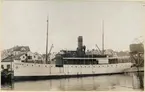 Foto i svartvitt visande passagerarmotorfartyget Sunnan av Vaxholm under gång på Stockholm Ström.