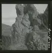 Pojke i kolt blickar ut över vattnet från ett fjäll.
