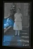 "Från Sthlm, taget i Österåker." Porträtt av en kvinna, ståendes ute på en snöig trappa.