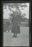 En ung kvinna klädd i vitt ståendes vid en björk. Hon håller en kvist med blad i ena handen. "Anne-Marie Larsson, Forartorp 1922."