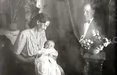 Rumsinteriör, barndop, familjegrupp tre personer. Anita och Rolf Östansjö