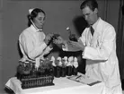 "Personalen på Ulleråker lämnar blod till armén" - sjuksköterskan Maja Öberg och läkaren Thore Gustafsson med blod som personal på Ulleråkers sjukhus lämnat, Uppsala oktober 1941