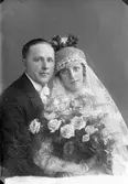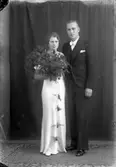 Enligt fotografens journal nr 6 1930-1943: "Fredriksson, Orrvar Hålkekärr Ucklum". Enligt fotografens notering: "Brudparet Larsson-Fredriksson i bröllopsgård Stenungsgård".