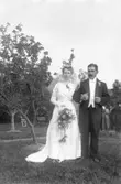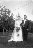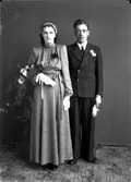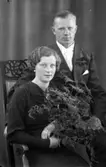Enligt fotografens journal nr 6 1930-1943: "Fredriksson, Orrvar Hålkekärr Ucklum". Enligt fotografens notering: "Brudparet Larsson-Fredriksson i bröllopsgård Stenungsgård".