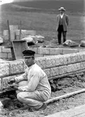 Byggnadsarbete, en man. Fjärrvärmekulvert med fasta lock. Löst innerlock läggs på, armering viks ner och betong gjuts över det lösa locket.
