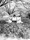 Ellen i Kalvhult står finklädd vid ett syrenbuskage med en kvist i handen. I bakgrunden syns ett bostadshus. Hon har en klockad hatt, pärlhalsband och rävstola. (Se även bildnr EA0462)