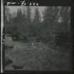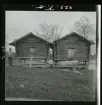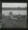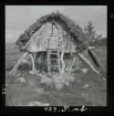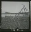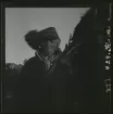 En man klädd i slips och kavaj sitter utanför en kåta. I knät har han en komsio/ geittka, en samisk vagg, med ett litet barn i.
