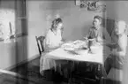 Edvard Lindbloms matvaruaffär. Julbordet står dukat. Längst till vänster skräddarmästare Karl Nilsén och andra från höger Edvard Lindblom. Uppgifter om namn har lämnats av Göte Nilsén