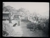 Elsa, Gudrun och en hund bland vitsipporna på tomten till familjen Morthensens villa Solveden, Djursholm.