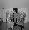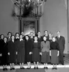 Skara Manskörs 30-årsjubileum, 1951. Körens ordförande Sam Magnusson mottager vänorten Eidsvolls manskörs gåva. Sittande stadsfullmäktiges ordförande Rudolf Andersson och Västergötlands sångarförbunds ordförande landshövding Richert.