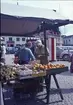 Enligt fotografens noteringar: "Torgdag i Munkedal vid lilla Järnvägsstationen. H. Trogen vid sitt stånd längst till vänster. Grönsaksstånd m.m."