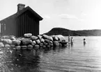 Enligt Bengt Lundins noteringar: "Ulvesund. Strandbadet bad och båthus".