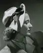 Porträtt av kvinna med hatt i svart sammet och filt, av Claude S:t Cyr. Hatt använd vid franska avdelningens uppvisning september 1947.