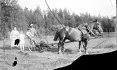 Slåtter. Till höger en man med en lie. Till vänster en flicka och en pojke som samlar upp höet.