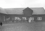 FOLK PÅ LADUGÅRDSBACKEN MED OXAR OCH HÄSTAR. VID VÄGGEN T.H. EN TRÖSKVANDRING.