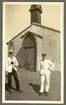 Bilden visar en sjöman med skyddskläder och flytväst stående mellan byggnader på Gålö.