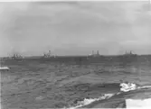 Till sjöss syns pansarskeppen Gustav V samt Sverige (efter ombyggnaden 1945), Lasarettfartyget Prins Carl och en Ubåt. I bakgrunden skymtar land.
