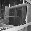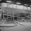 Utställning varvsbilder Plastverkstaden 1987. Till vänster ribbspantformen till skrovet för minröjningsfartyg typ Landsort. Till höger en plastfärdig sidokölsvävare- ett