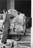 Det iordninggjorda paketet på väg att lastas i godsfinka vid Stockholm Ban.
