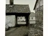 Ekonomibyggnad med halmtak med portlider mot öster och infarten från vägen till Norrmans bondgård. Backa nr 7:2. Till vänster ses bostadshuset med flacktegel på taket. Gårdsytan är stenlagd. (Se även bildnr G8454)