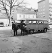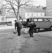 Korsningen av Stor- och Hamngatan i Linköping. Vy mot söder. I blickfånget Storgatan 4 som uppfördes 1888 som stadens fattighus för kvinnor. Med tiden kom hemmet även ta emot manliga behövande likväl som barn. Här dokumenterat 1956 kort före rivning.