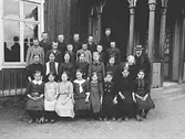Lärarinnan fru Andersson, född Lindencrona, gift med folkskollärare J.A. Andersson. På lärarinnans högra sida Carl Wästerberg. I gruppen finns en Hellberg och en flicka Blom.