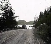 På väg till en friluftsgudstjänst i Halland. Kortet taget utanför scoutstugan. I första vagnen (saxfjädervagn), Gustava och Bernhard Lundberg. Hildur Lundberg vid cykeln. Kusk: Arrendator Samuel Sandén. I andra vagnen (långfjädervagn) en broder till B. Lundberg, Axel, med hustru. Axel Lundberg hade en stor manufakturaffär vid torget i Uddevalla. Reprofotograf: Gunnar Berggren.