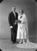 Ett brudpar hos fotografen. Bruden i knäkort vit brudklänning med slöja, brudgummen i frack med handskar. Helfigur. Ateljéfoto. Under bilden står antecknat: "Copy Welinder" (trol. hovfotografen Edvard Welinder, Stockholm). Margareta Bergstedt och Carl Fridolf (C.F.) Lidén på deras bröllopsdag i Växjö, december 1928.