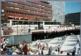 "Den stora fredsresan" med sina vita bussar, gör uppehåll vid Sergels torg i Stockholm.