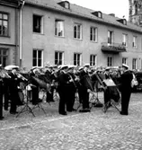 Spexutklädda studenter på Stockholms nations gård, Uppsala 1905