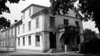 "I detta hus, Kyrkogatan 2, Hjo, föddes Yngve Sjöstedt den 3 aug. 1866. (Balkongen från senare tider). Bottenvåningen var delvis uthyrd till Skaraborgs Läns Enskilda Bank."