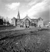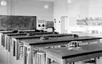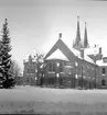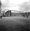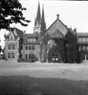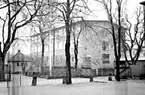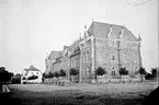 Skara Elementarläroverk från vänster. Längst ned till vänster på bilden finns det ett antal hästkärror, antingen med flit inkopierade eller av misstag, vi vet ej.
