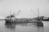 Befälhavarens skrivhytt sedd från babords sida. Väggar av polerad flammig björk i naturfärg, beigefärgade gardiner och möbeltyg, elektrisk armatur av cremefärgat mattslipat glas, matta enfärgad blå och gul.
