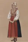 "Malung". Kvinna i dräkt. Akvarell av P Södermark.