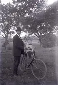 Barn och man i trädgård vid vattnet, Krusenberg, Uppland