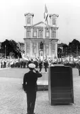 Fontänen på Stortorget med Restaurang Stortorget i bakgrunden, 1980-tal