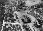 Bild över Stortorget, västerut mot Nikolaikyrkan. Stortorget 14, Hotell Örebrohus (Stortorget 12). (Glasplåten är trasig, Nikolaikyrkan syns inte på bilden).