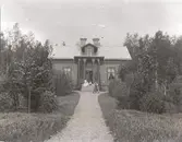Råskogsstugan c.detalj av stugan e. gaveln av stugan g. stugans eksyll. h. besökare vid stugan Brålanda