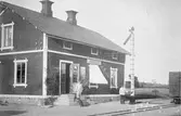 Stationskuren i Långsjön, med ställverk och expedition. Långsjö-Pelle med hund.