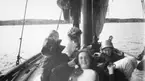 Vy över Skallöarna. Norra Skallö ligger närmast i bilden med den delvis undersökta skansen bakom bergsplatån. Undersökning år 1967 av skansen på Norra Skallö med anledning av att Ölandsbrons stöd skulle vila på skansens södra delar.