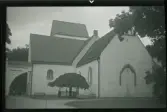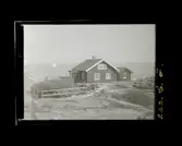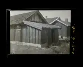 Två unga kvinnor framför ett hus. En stege står uppställd mot taket.
