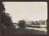 "Upsala, ån utanför Magdeburg", vy från Västra Strandgatan över Fyrisån mot kvarteret Lindormen, Uppsala 1913