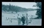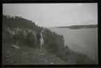 Fyra unga män vilar i kanoter som dragits upp på land. "Läger på Fredagsholmen 1906".