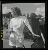 585/8 Facit Tokyo Daberg. Facit baseboll-lag poserar på flaket av en liten trehjulig bil.
