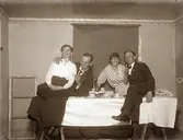 Fikastund i Brattåsgårdens hobbylokal (Streteredsvägen 5), 1990-tal. Sittandes från vänster: 1. Einar, 2. Knut Jerkfelt, 3. skymd, samt 4. kvinnlig vårdbiträde.