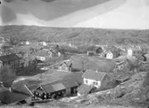 Bohuslän, Gullholmen. Fiskebodar, bryggor, båtar. Teckning av Ferdinand Boberg