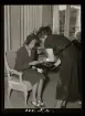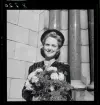 "1680 Bröllop i luften med Abas DC-4 ""Sunnan"" till Paris ". En brud sitter i ett flygplan med brudbukett och telegram i famnen.